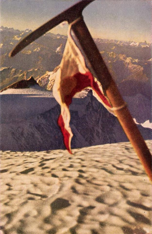 Hermann Buhl’s famous shot with ice axe on the Nanga Parbat summit with a view to the Silver Plateau below. Photo ©: Hermann Buhl Archives.