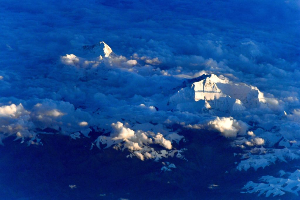 The perspective is illustrated by the summits of Makalu [left (8,462 meters; 27,765 feet)] and Everest [right (8,850 meters; 29,035 feet)] – at the heights typically flown by commercial aircraft.