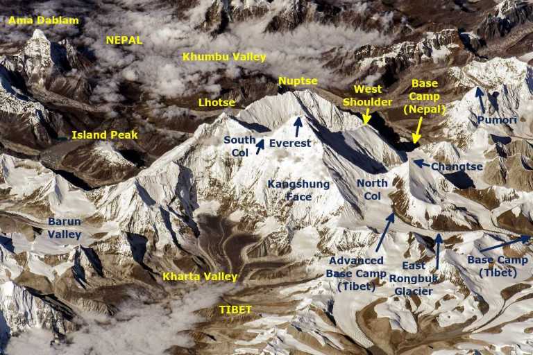 The picture is taken from the north-east, Tibetan, side of the mountain, looking over the Kharta Valley at the Kangshung Face. The northern half of the photo is Nepal’s Khumbu Valley, which looks surprisingly low and flat. The annotation of this photograph was posted by Mark Horrell in his blog.